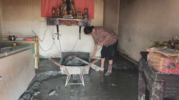 年近七十岁的杨姓老人,大水来的时候幸运逃过一劫,但事后清淤泥,全靠她自己一个人拿着铲子慢慢挖,挖了两天都不见成效,她的脚因为长期泡在泥水里,早已红肿,一只脚发炎疼痛,只好一只脚穿布鞋,另一只脚穿雨鞋。